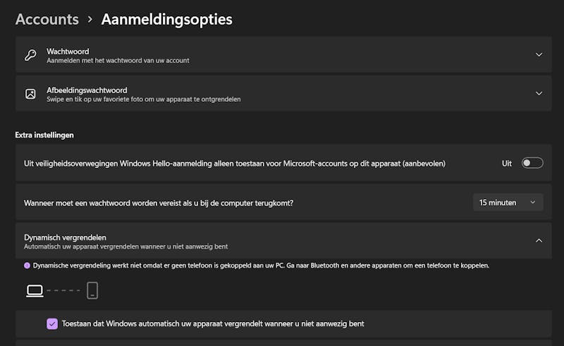 Voor vergeetachtige gebruikers is er de Dynamische vergrendeling, een automatische beveiliging gebaseerd op bluetooth. Deze functie is beschikbaar in Windows 10 en 11. Het enige wat je nodig hebt, is een pc die uitgerust is met bluetooth en een Android-telefoon of iPhone met bluetooth. Dynamische vergrendeling koppelt via bluetooth je pc met je telefoon. Wanneer je met de telefoon op zak weggaat, zal het bluetooth-signaal verzwakken en wegvallen. Als Windows dit detecteert, zal het de pc vergrendelen.