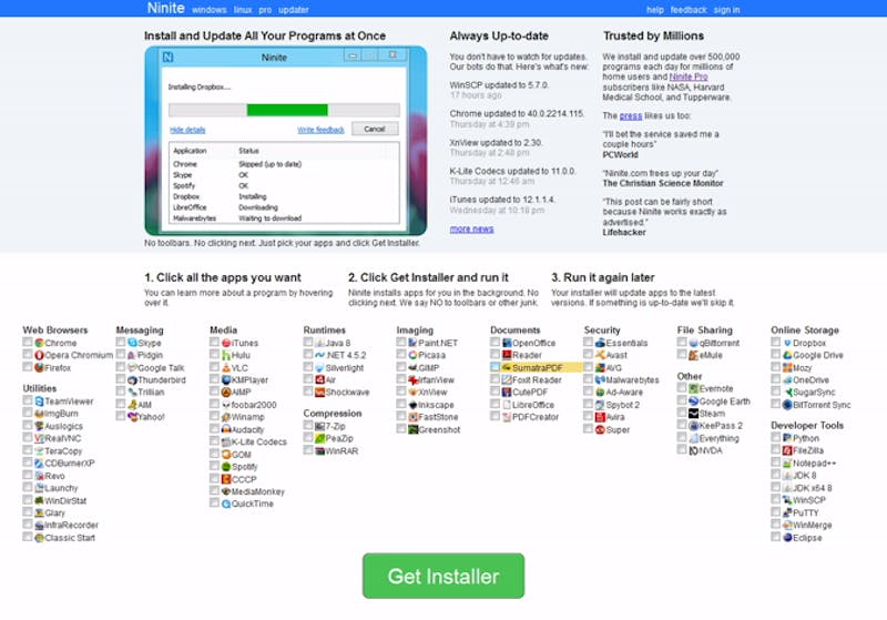 Neem je een nieuwe pc in gebruik of installeer je je besturingssysteem opnieuw? Dan ben je meestal uren bezig om alle software te installeren die je nodig hebt. Dat kan anders! Ninite bespaart tijd en kopzorgen en installeert alles met één muisklik terwijl jij de krant leest.